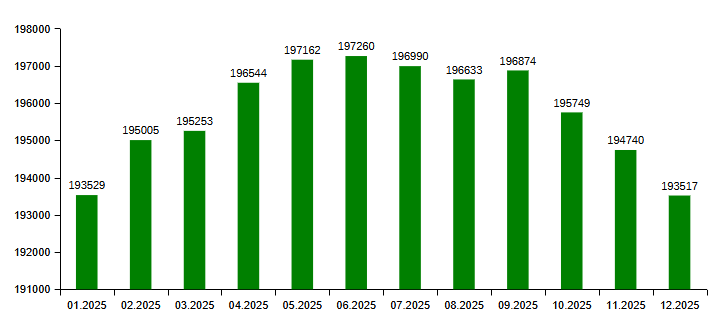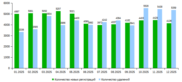 .KZ (01.2025 - 12.2025) доменіндегі домендік атаулардың жаңа тіркелулері мен жойылуларының айлық саны.