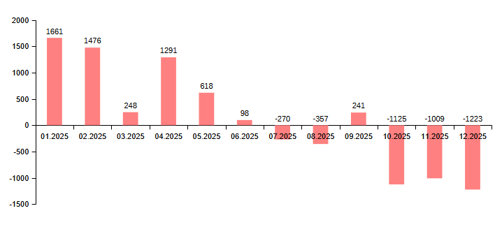 .KZ (01.2025 - 12.2025) доменіндегі домендік атаулардың жаңа тіркелулері мен жойылуларының айлық саны.